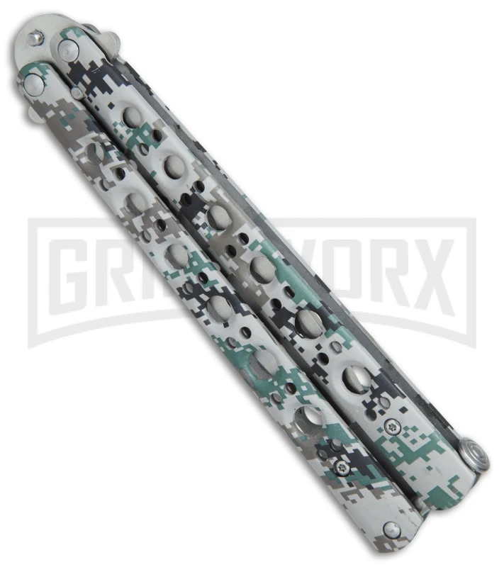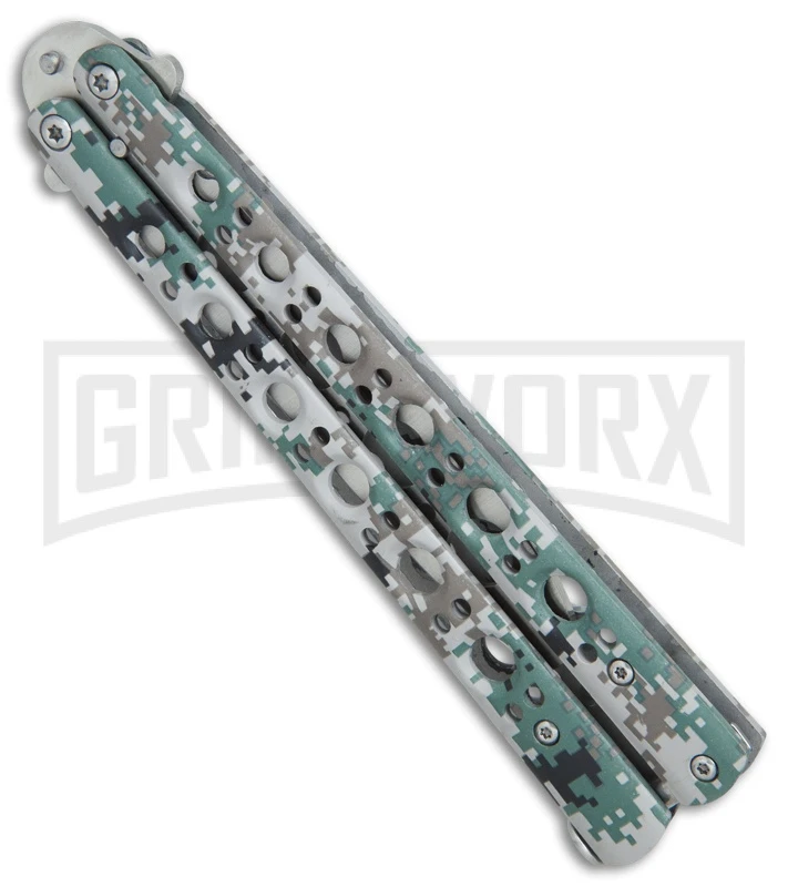 This Camo Fly Butterfly Trainer has a stainless steel handle with a green digi-camo finish and a satin finished trainer blade.
