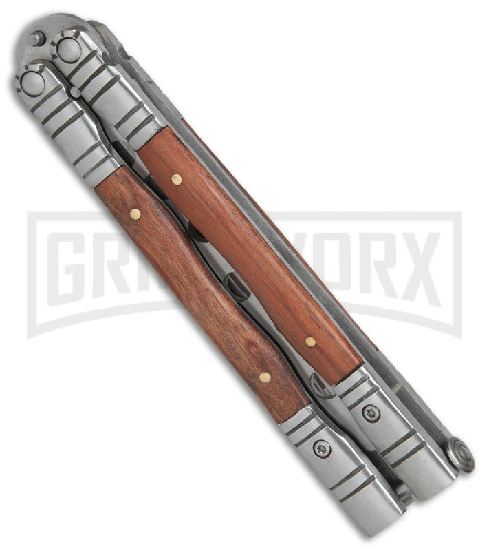 This Grift Butterfly Trainer sports a stainless steel handle with sleek rosewood scales and a satin finished trainer blade.