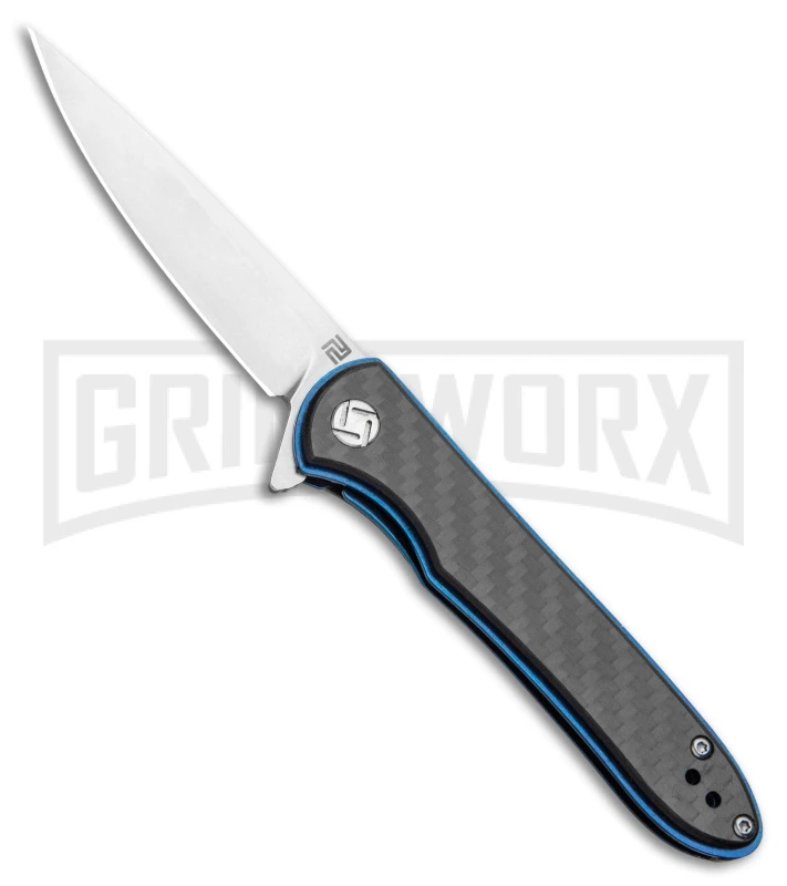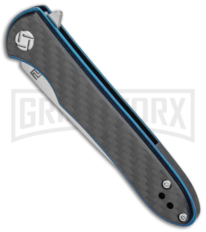 This Small Shark model has blue liners, a carbon fiber handle, and a stonewashed blade.