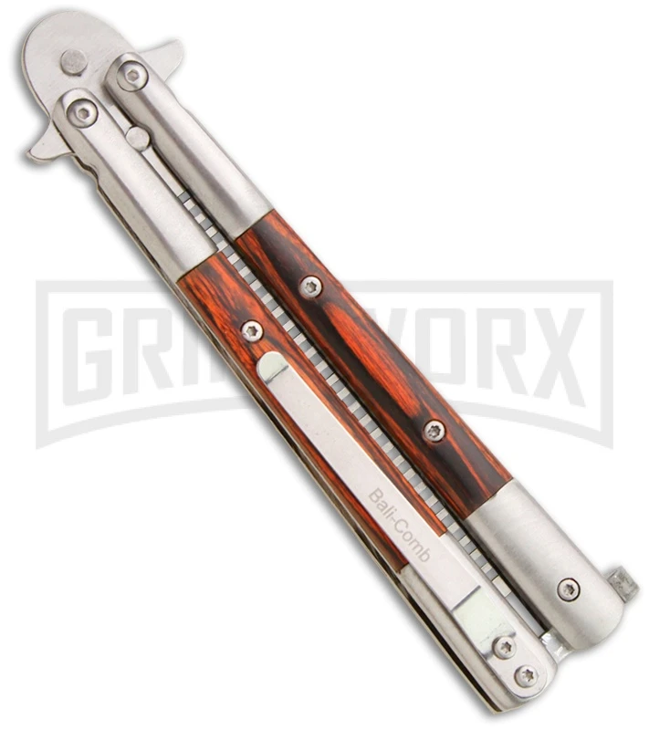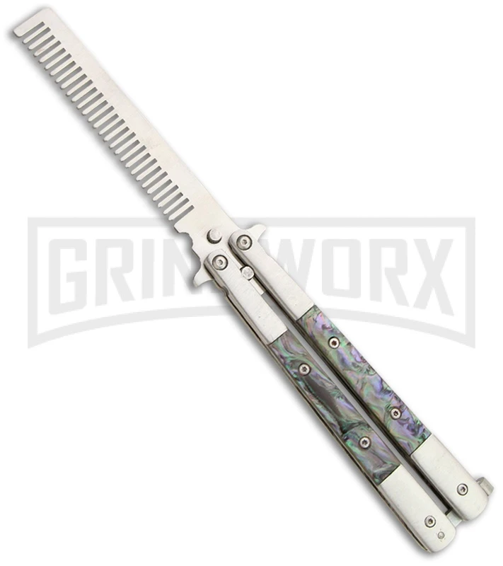 This Bali-Comb is a great butterfly knife for learning the art of flipping and keeping your hair in check as well. It features a stainless steel comb, not sharpened. The handle has steel liners and bolsters with sim abalone acrylic inserts. Includes pocket clip and t-latch