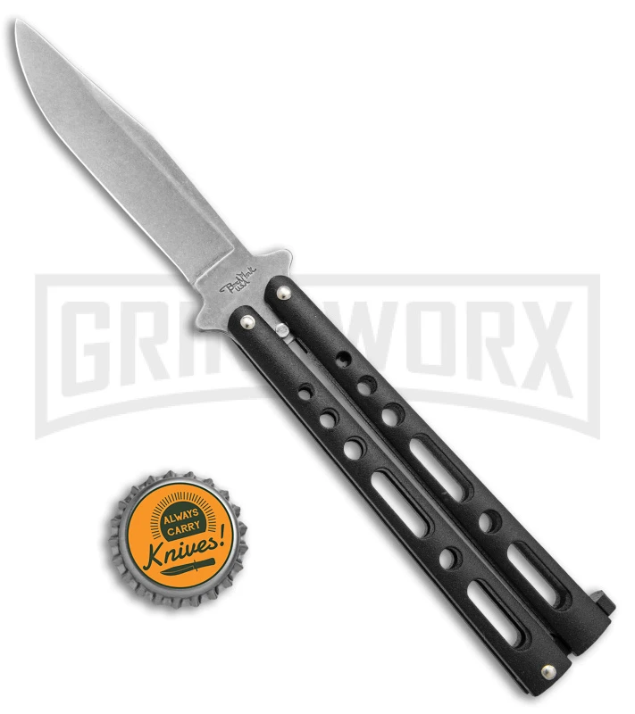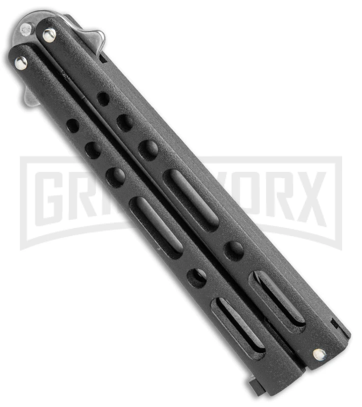 This Benchmark butterfly knife has a black epoxy-finished handle with a stonewashed blade.