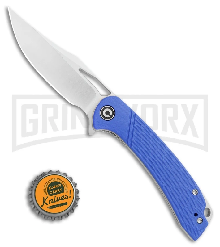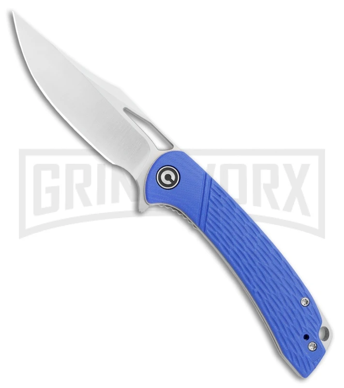 This Dogma model has a blue G-10 handle and a satin blade.
