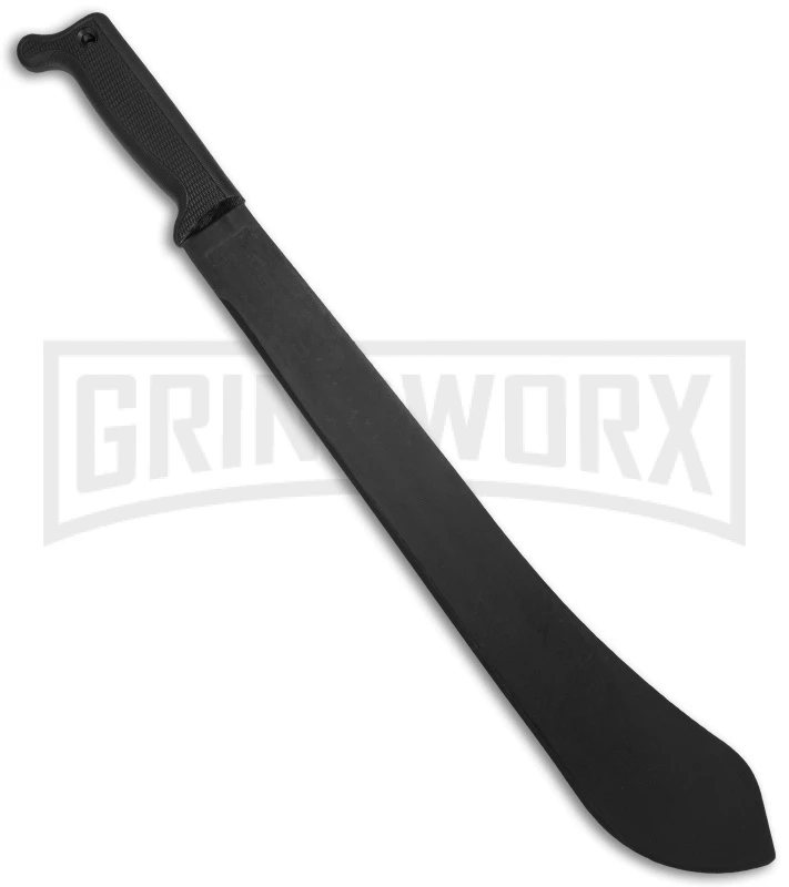 The Cold Steel Bolo Machete features a 1055 carbon steel blade with a black backed-on anti-rust matte finish and a 5-5/8″ polypropylene handle. Despite its monster size (23.625″ overall), this blade is amazingly light and agile. It weighs in at just over 1 lb., and with the unique “fat point” design of the blade, the weight is shifted forward so you can chop coconuts or trees with equal ease.
