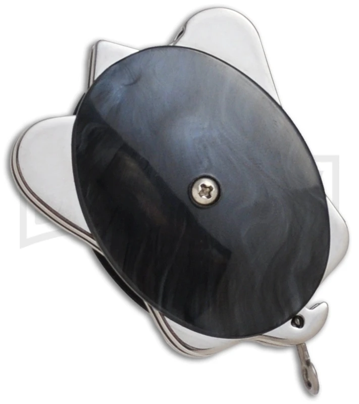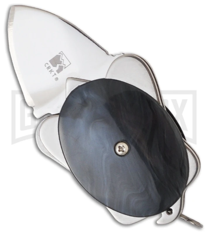 In lieu of exotic handle scale materials, CRKT discovered todays advanced CPL composites, used widely in modern bowling balls. This material is exceptionally strong and tough. The scales can be injection molded in an almost infinite variety of colors and swirl patterns. Four scale colors are available: black, brown, blue and white. Because of the molding process, the swirl patterns vary considerably, so every Turtle is unique. The Turtle frame is high-carbon stainless steel with a polished finish.