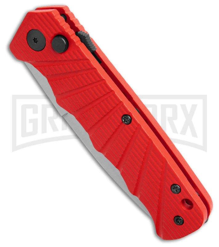 This model has a satin-finished plain edged blade in stainless steel and a textured red aluminum handle.