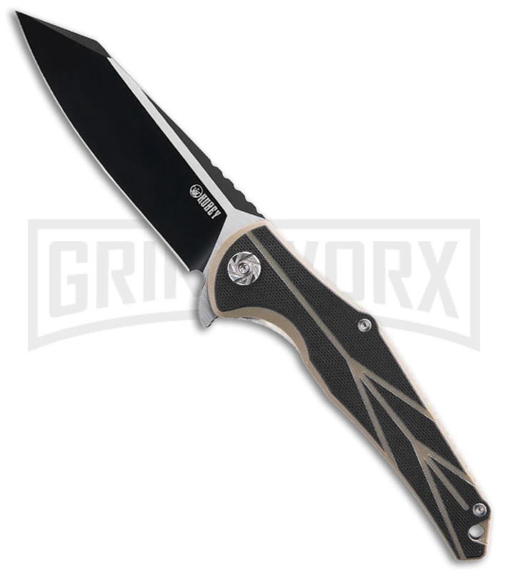 This knife has a black and tan G-10 handle.