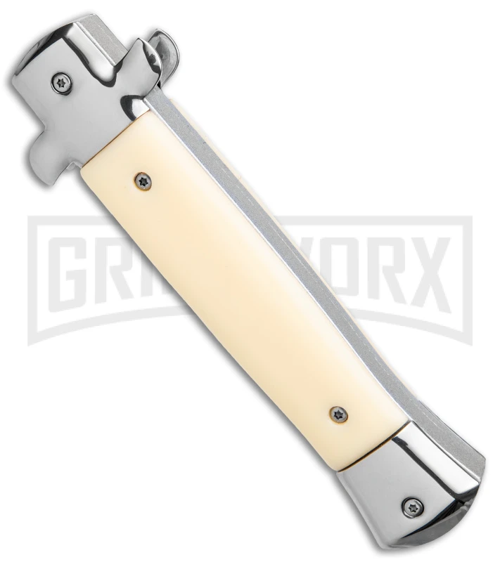 This 9″ Mago OTF model features a satin finished bayonet blade and a simulated ivory handle.