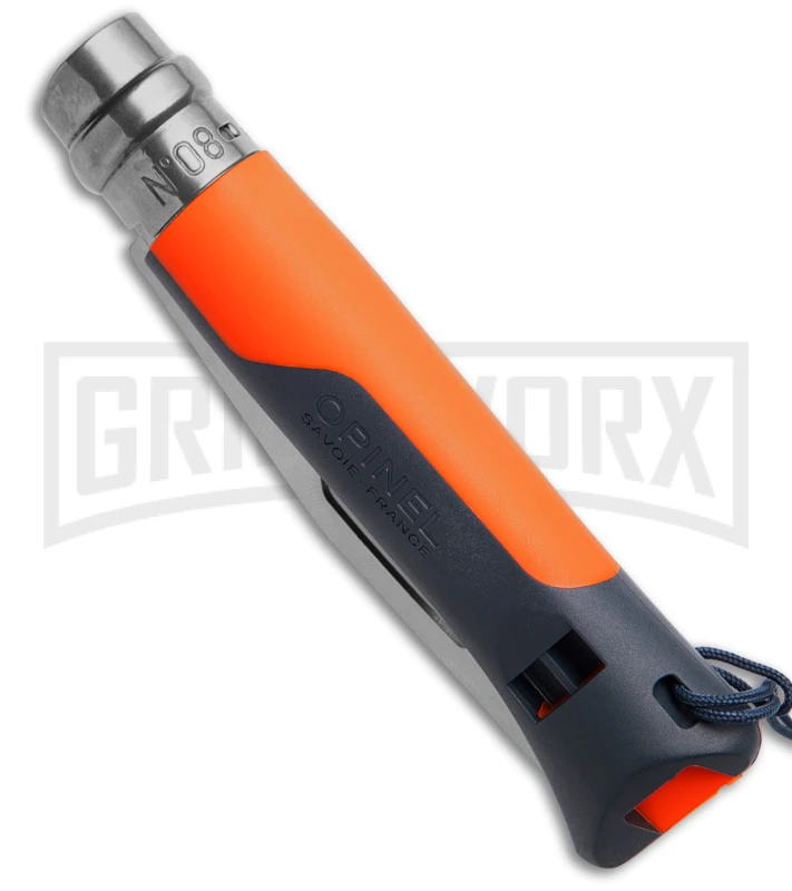 The #8 Outdoor Orange folder from Opinel has a Sandvik 12C27 stainless steel blade with a partially serrated ege. 4 mm-10 mm shackle key cut in blade. The polymer handle features a lanyard and integrated whistle that is good for 110 dB. Includes the Virobloc safety ring that locks the blade in the open and closed positions.