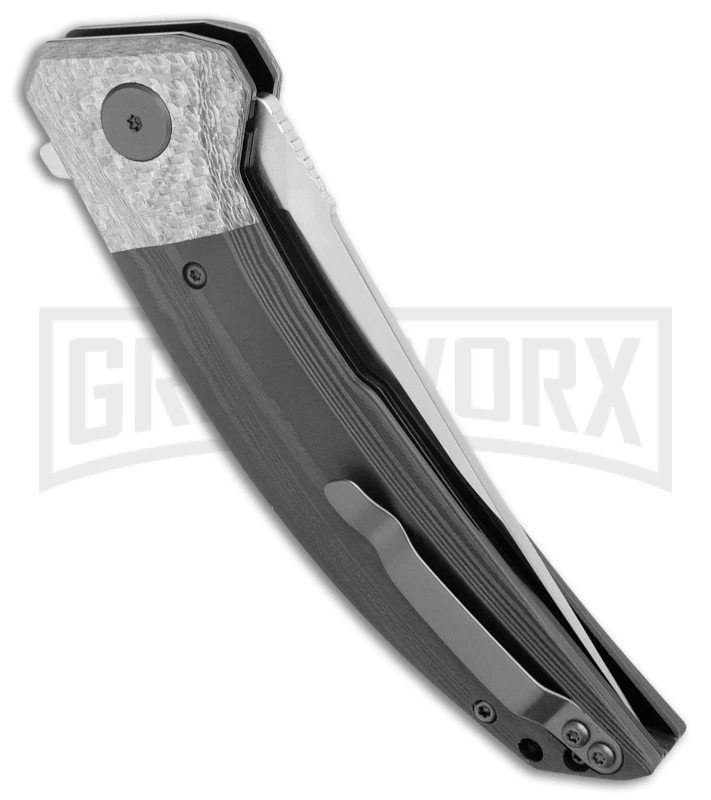 This Petrified Fish Deepsea liner lock knife has a silver and black carbon fiber handle and a satin-finished trailing point blade.