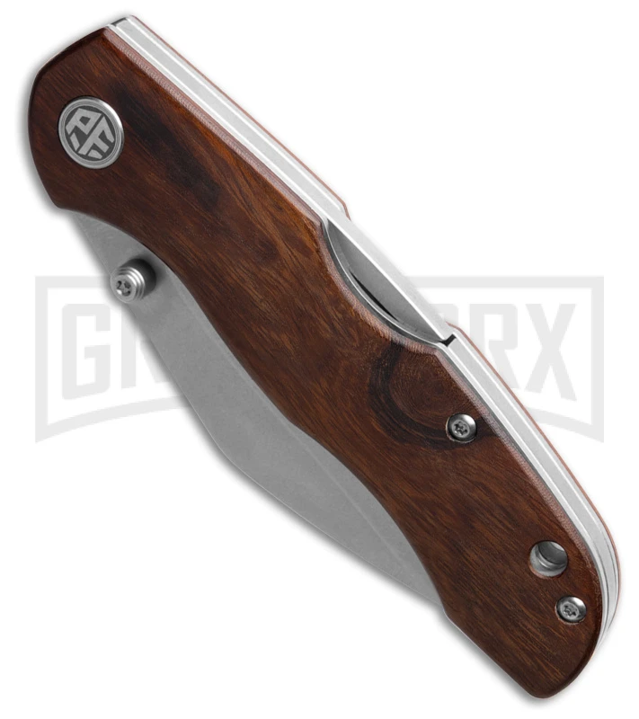 This model features a brown desert ironwood handle and a stonewashed finished, modified drop point blade of 154 CM steel.