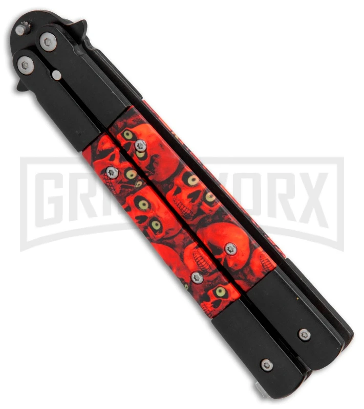 This Demon Trainer model sports a black stainless steel handle with red skull inserts and a black trainer blade.