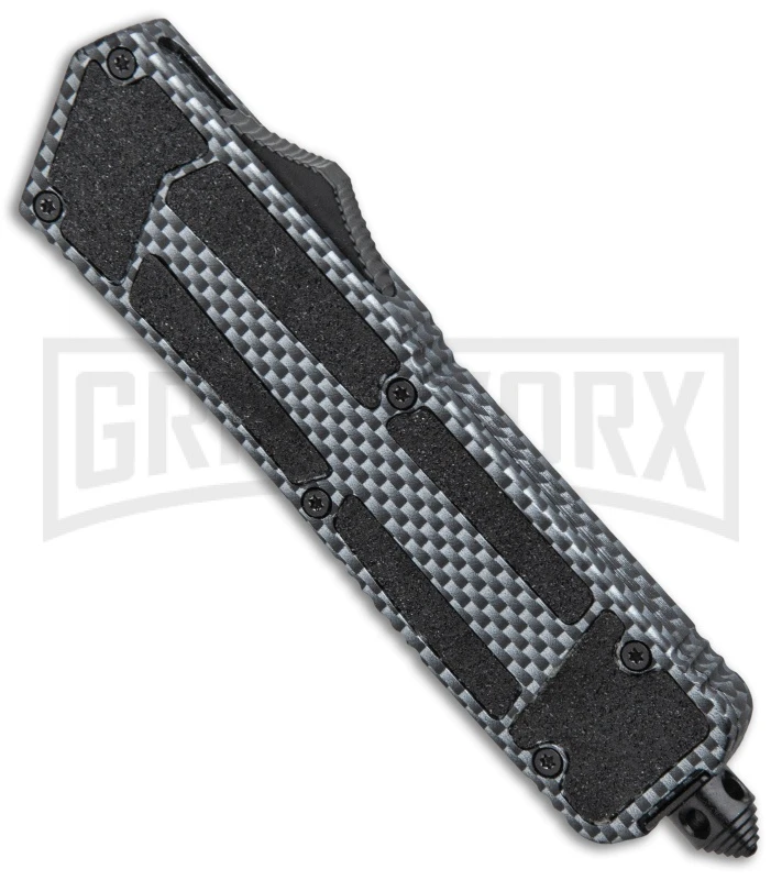 The Rumble is a budget double-action OTF knife with performance you’re sure to enjoy. This automatic knife fires open and closed with the slide of the firing button. This Rumble has a sim carbon fiber body with traction inserts for a solid grip and includes a glass breaker and pocket clip. The stainless steel clip point blade on this knife is black finished with a plain edge.