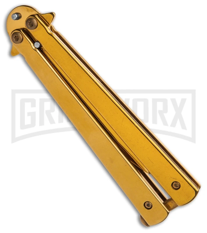 This Skipper balisong model comes with a gold handle and blade made from stainless steel. It offers sturdy torx screw construction with a dual tang pin design. The blade comes in a spear point style with a plain cutting edge. Item includes a stainless steel latch for securing the knife in the open or closed position.