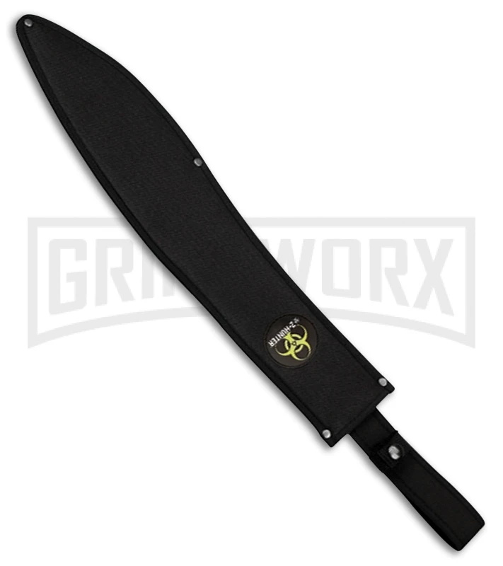 The Z-Hunter Assailant is a machete for tactical use. If you are looking for a machete to hone your zombie hunter skills you have found it. This model has a black finished stainless steel, spear point blade with a partial sawback and thumb ridge. The handle is finger-grooved, textured neon green nylon fiber with a finger guard and dual lanyard holes with a black nylon cord lanyard. Included is a black nylon belt sheath with a rubber patch logo and a black adjustable shoulder strap.